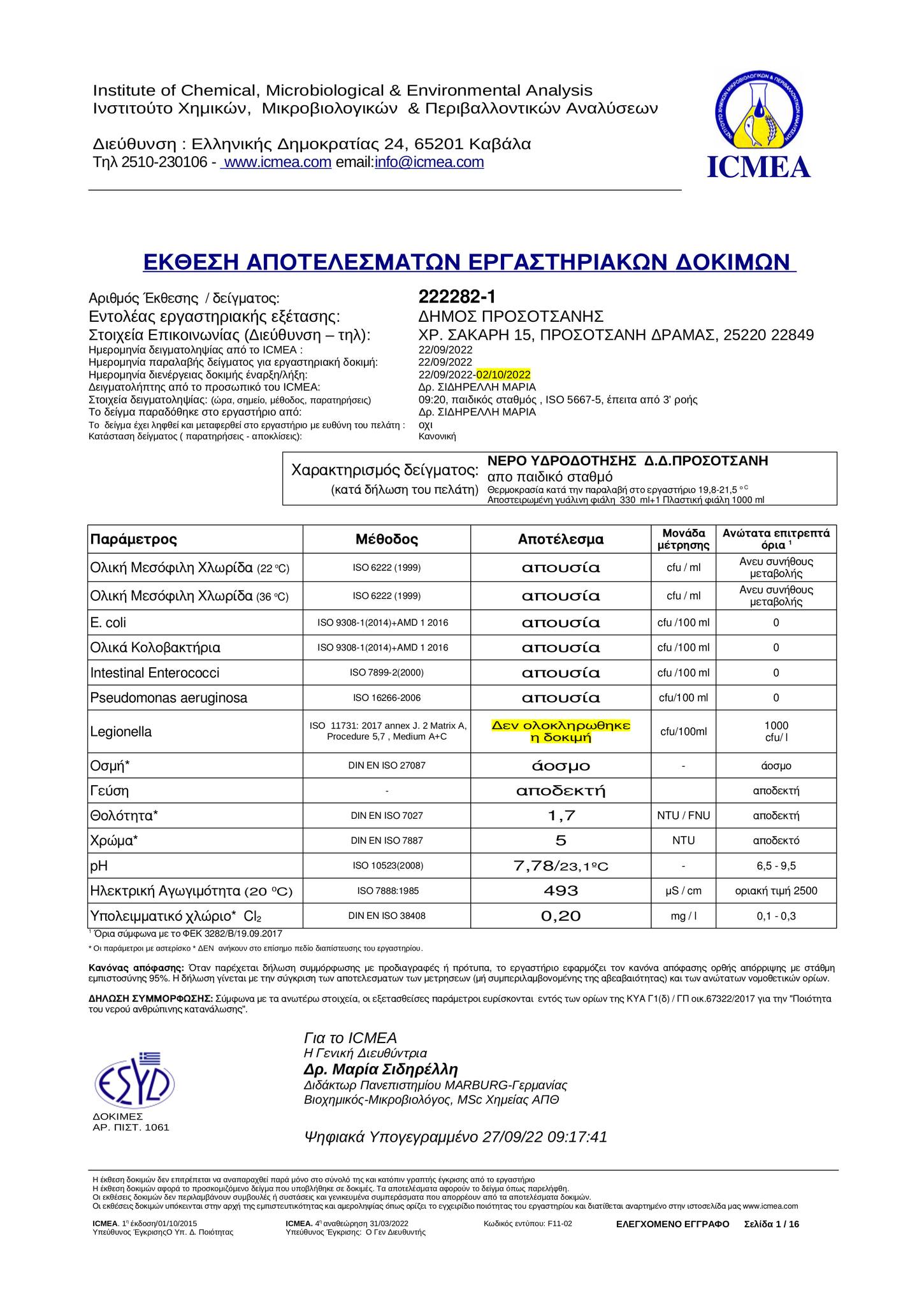 ΕΚΘΕΣΗ ΑΠΟΤΕΛΕΣΜΑΤΩΝ ΕΡΓΑΣΤΗΡΙΑΚΩΝ ΔΟΚΙΜΩΝ ΓΙΑ ΤΟ ΝΕΡΟ ΤΗΣ ΠΡΟΣΟΤΣΑΝΗΣ