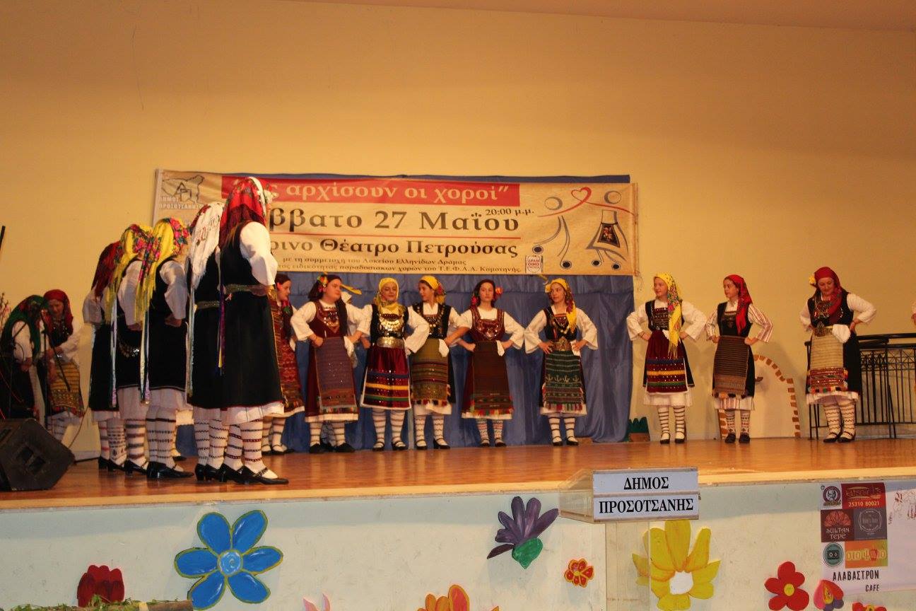 Το Σάββατο 27 Μαΐου πραγματοποιήθηκε στην Αίθουσα Πολλαπλών Χρήσεων της Δ.Κ. Προσοτσάνης, παρουσία 500 και πλέον θεατών, η παράσταση του Πολιτιστικού Συλλόγου Πετρούσας “Ας αρχίσουν οι χοροί” με τη συμμετοχή του ΤΕΦΑΑ Κομοτηνής στην ειδικότητα παραδοσιακών χορών με 50 χορευτές, το Λύκειο Ελληνίδων Δράμας και σύσσωμος ο Πολιτιστικός Σύλλογος Πετρούσας με 120 χορευτές. Μετά το τέλος της παράστασης, η βραδιά συνεχίστηκε με μεγάλο παραδοσιακό γλέντι στην αίθουσα του Πολιτιστικού Συλλόγου Πετρούσας, όπου και κράτησε μέχρι τις πρώτες πρωινές ώρες.