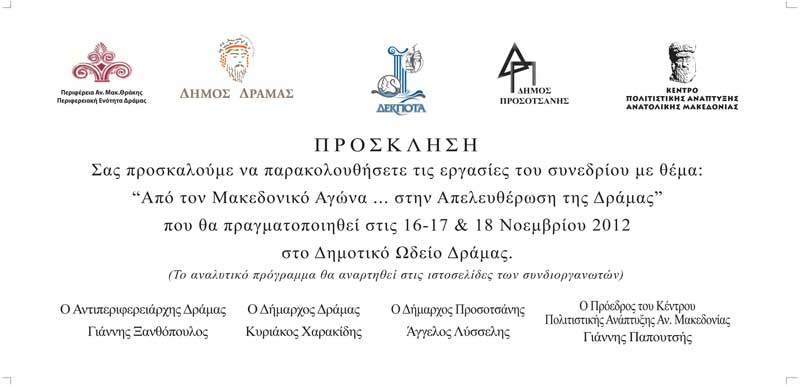 Το "Κέντρο Πολιτιστικής Ανάπτυξης Ανατολικής Μακεδονίας" σε συνεργασία με την Περιφερειακή Ενότητα Δράμας, το Δήμο Δράμας, τη ΔΕΚΠΟΤΑ του Δήμου Δράμας και το Δήμο Προσοτσάνης, εν όψει των 100 χρόνων από την απελευθέρωση της Δράμας και της ευρύτερης περιοχής μας, συνδιοργανώνουν 3ήμερο επιστημονικό ιστορικό συνέδριο με θέμα: "Από τον Μακεδονικό Αγώνα... στην απελευθέρωση της Δράμας" στις 16-17 & 18 Νοεμβρίου 2012 στο Δημοτικό Ωδείο Δράμας.