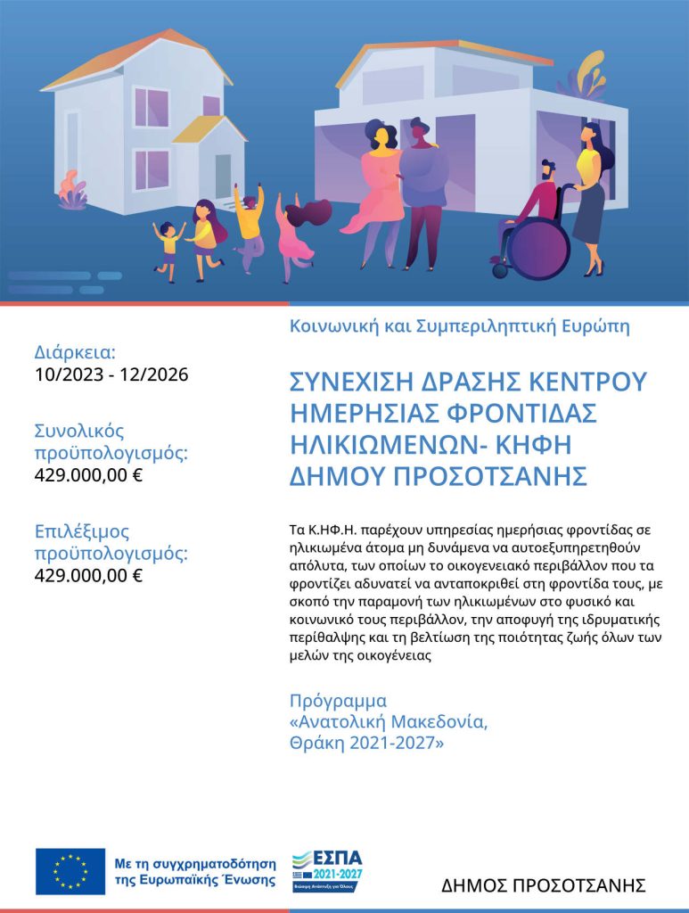 Το Κέντρο Ημερήσιας Φροντίδας Ηλικιωμένων «Κ.Η.Φ.Η.» Δήμου Προσοτσάνης λειτουργεί στο πλαίσιο της πράξης: «Συνέχιση Δράσης Κέντρο Ημερήσιας Φροντίδας Ηλικιωμένων – ΚΗΦΗ Δήμου Προσοτσάνης», με κωδικό ΟΠΣ 6002638 στο Επιχειρησιακό Πρόγραμμα «Ανατολική Μακεδονία, Θράκη 2021-2027» και συγχρηματοδοτείται από το Ευρωπαϊκό Κοινωνικό Ταμείο.