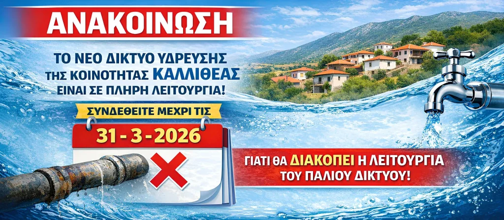 Aνακοίνωση για Σύνδεση στο νέο δίκτυο ύδρευσης Κοινότητας Καλλιθέας