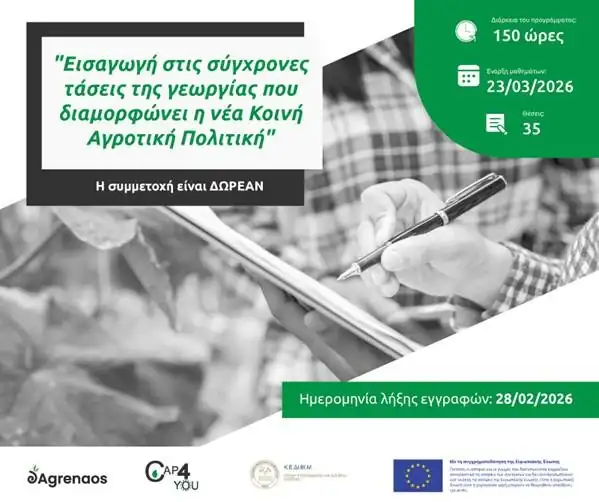 Πρόγραμμα Επιμόρφωσης στον Τομέα της Γεωπονίας: Εισαγωγή στις σύγχρονες τάσεις της γεωργίας που διαμορφώνει η νέα Κοινή Αγροτική Πολιτική