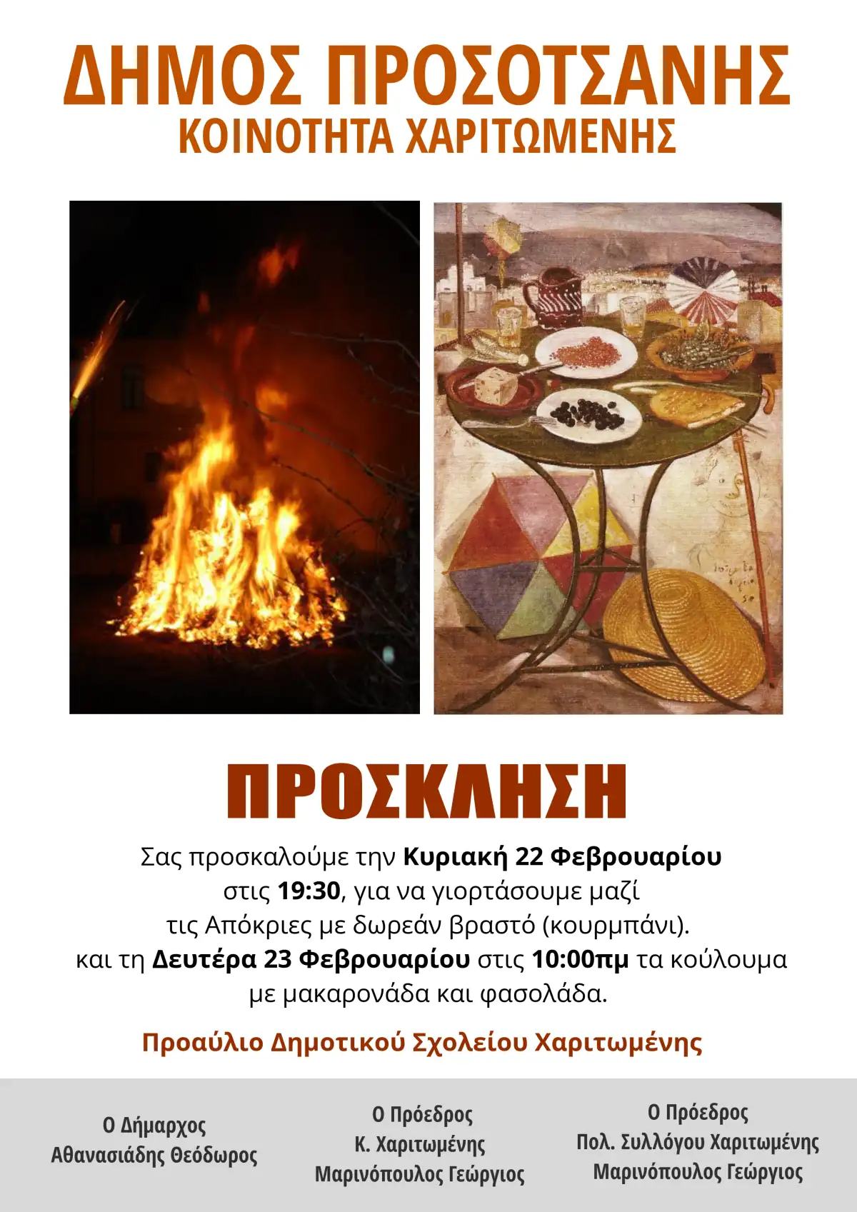 Στην κοινότητα της Χαριτωμένης, οι ημέρες της Αποκριάς και της Καθαράς Δευτέρας δεν είναι απλώς μια ανάπαυλα από την καθημερινότητα, αλλά μια επιστροφή στις ρίζες και τις αξίες της συλλογικότητας. Με επίκεντρο το προαύλιο του Δημοτικού Σχολείου, οι κάτοικοι και ο Πολιτιστικός Σύλλογος αναβιώνουν έθιμα που αντέχουν στον χρόνο.