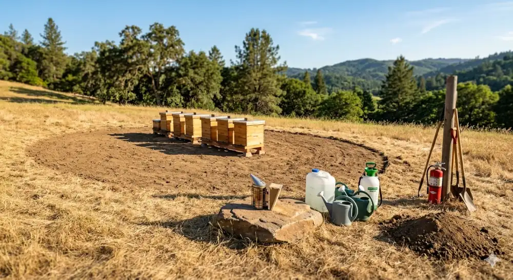 - Διατήρηση ικανής ποσότητας νερού, ανάλογα με τον αριθμό των κυψελών, δοχείο μεταφοράς νερού, ποτίστρες νερού ή γεωργικός ψεκαστήρας, πυροσβεστήρας νερού ή βάσεως αφρού, εργαλεία όπως πτυοσκάπανα και ύπαρξη εδαφικού υλικού για χωματοκάλυψη/επιχωμάτωση εστιών καύσης.