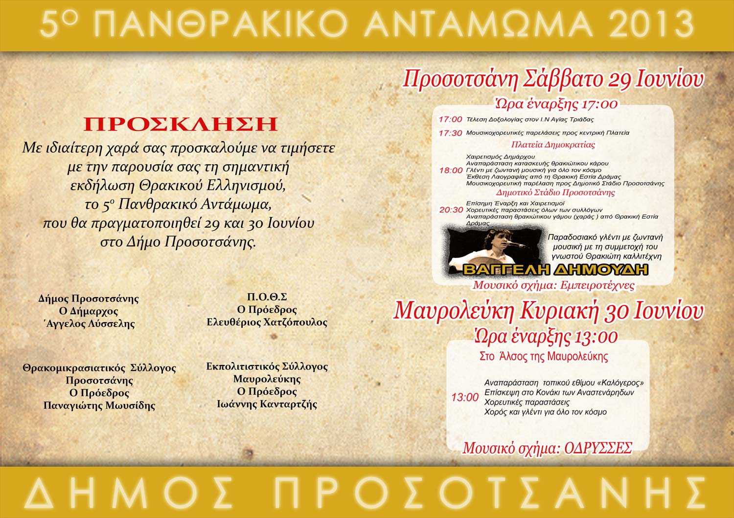 Χαιρετισμός Δημάρχου Αναπαράσταση κατασκευής θρακιώτικου κάρου Γλέντι με ζωντανή μουσική για όλο τον κόσμο Έκθεση Λαογραφίας από τη Θρακική Εστία Δράμας Μουσικοχορευτική παρέλαση προς Δημοτικό Στάδιο Προσοτσάνης |