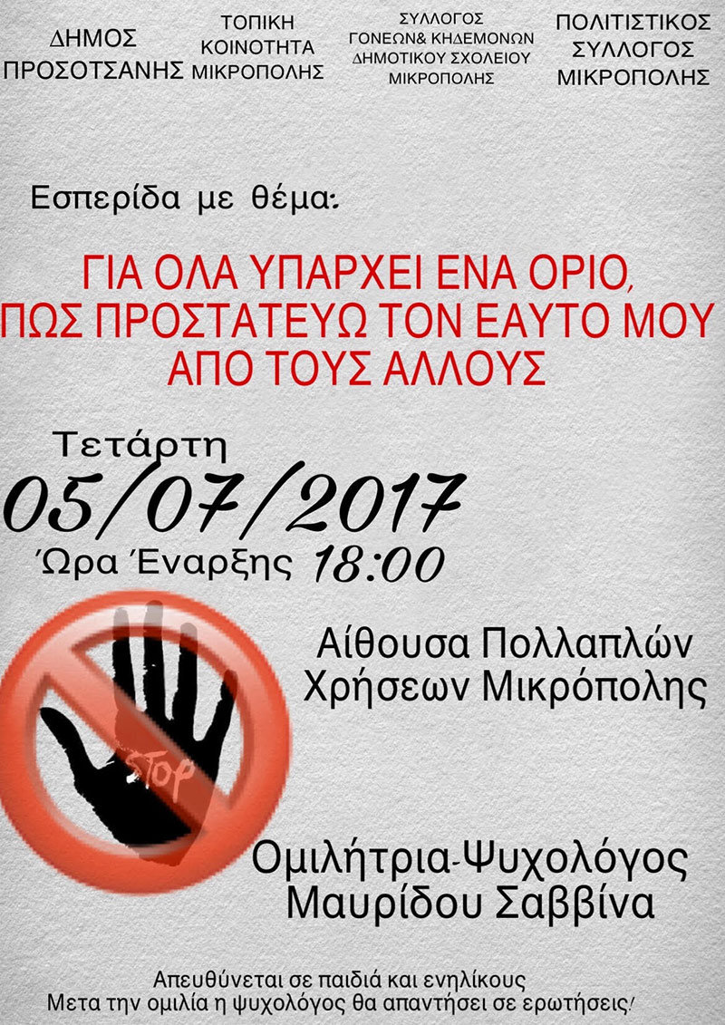 Εσπερίδα με θέμα: Για όλα υπάρχει ένα όριο, πως να προστατεύω τον εαυτό μου από τους άλλους. Τετάρτη 5 Ιουλίου 2017 και ώρα 18:00 - Τ.Κ. Μικρόπολης
