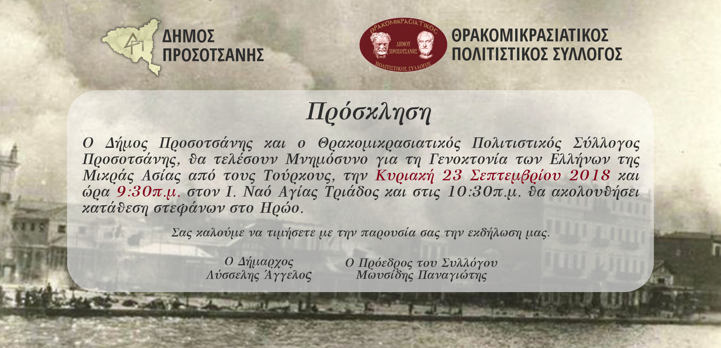 Μνημόσυνο για τη Γενοκτονία των Ελλήνων της Μικράς Ασίας - Κυριακή 23 Σεπτεμβρίου 2018 και ώρα 9:30π.μ.