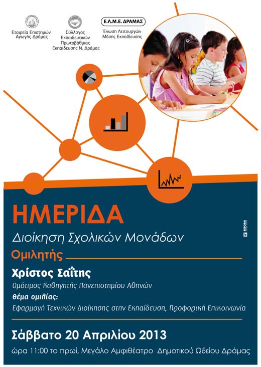 Η Εταιρεία Επιστημών Αγωγής Δράμας (ΕΤΕΑΔ), ο Σύλλογος Εκπαιδευτικών Πρωτοβάθμιας Εκπαίδευσης Ν. Δράμας και η Ένωση Λειτουργών Μέσης Εκπαίδευσης (ΕΛΜΕ) Δράμας διοργανώνουν το Σάββατο 20 Απριλίου 2013, στις 11:00, στο Αμφιθέατρο του Δημοτικού Ωδείου Δράμας, Ημερίδα με θέμα: Διοίκηση Σχολικών Μονάδων, με ομιλητή τον κ. Χρίστο Σαΐτη, Ομότιμο Καθηγητή του Πανεπιστημίου Αθηνών και θέμα ομιλίας: «Εφαρμογή Τεχνικών Διοίκησης στην Εκπαίδευση, Προφορική Επικοινωνία».