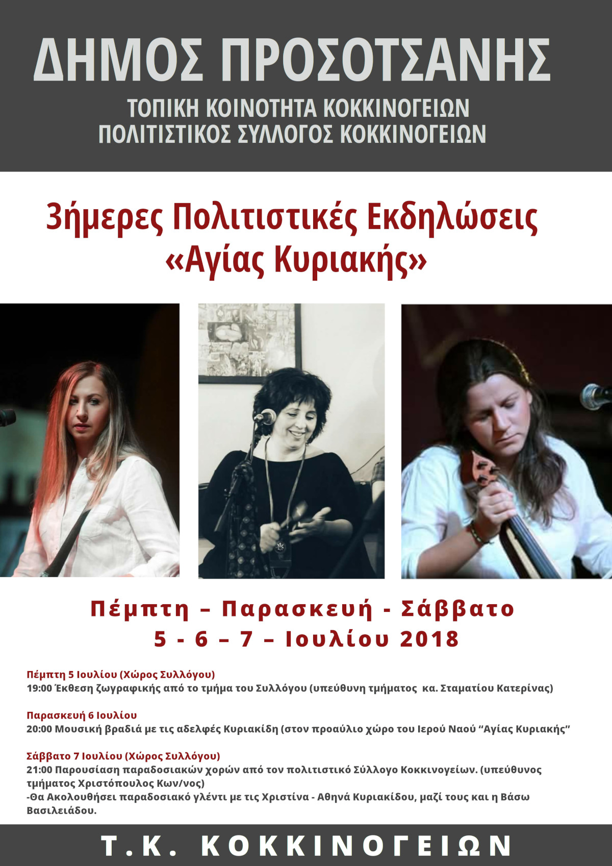 Τ.Κ. Κοκκινογείων: 3ήμερες Πολιτιστικές Εκδηλώσεις «Αγίας Κυριακής» 5-6-7 Ιουλίου 2018