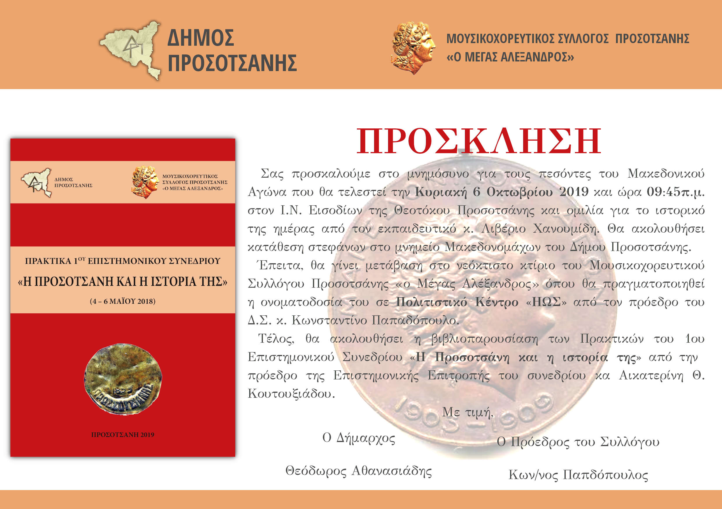 Μνημόσυνο Μακεδονικού Αγώνα και βιβλιοπαρουσίαση των Πρακτικών του 1ου Επιστημονικού Συνεδρίου "Η Προσοτσάνη και η Ιστορία της" (Κυριακή 6 Οκτωμβρίου και ώρα 09:45πμ)