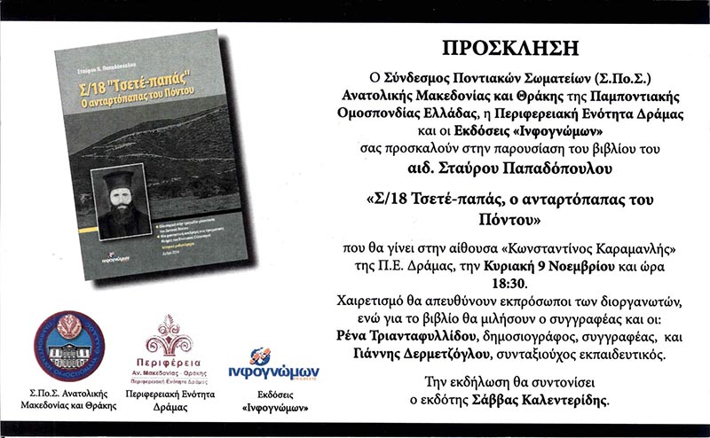 Παρουσίαση βιβλίου ''Σ/18 Τσετέ-παπάς, ο ανταρτόπαπας του Πόντου'' Κυριακή 9 Νοεμβρίου και ώρα 18:30