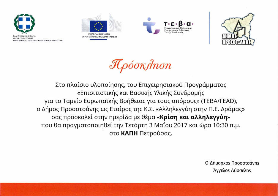 Ημερίδα με θέμα: Κρίση και αλληλεγγύη - Τετάρτη 3 Μαΐου 2017 και ώρα 10:30πμ