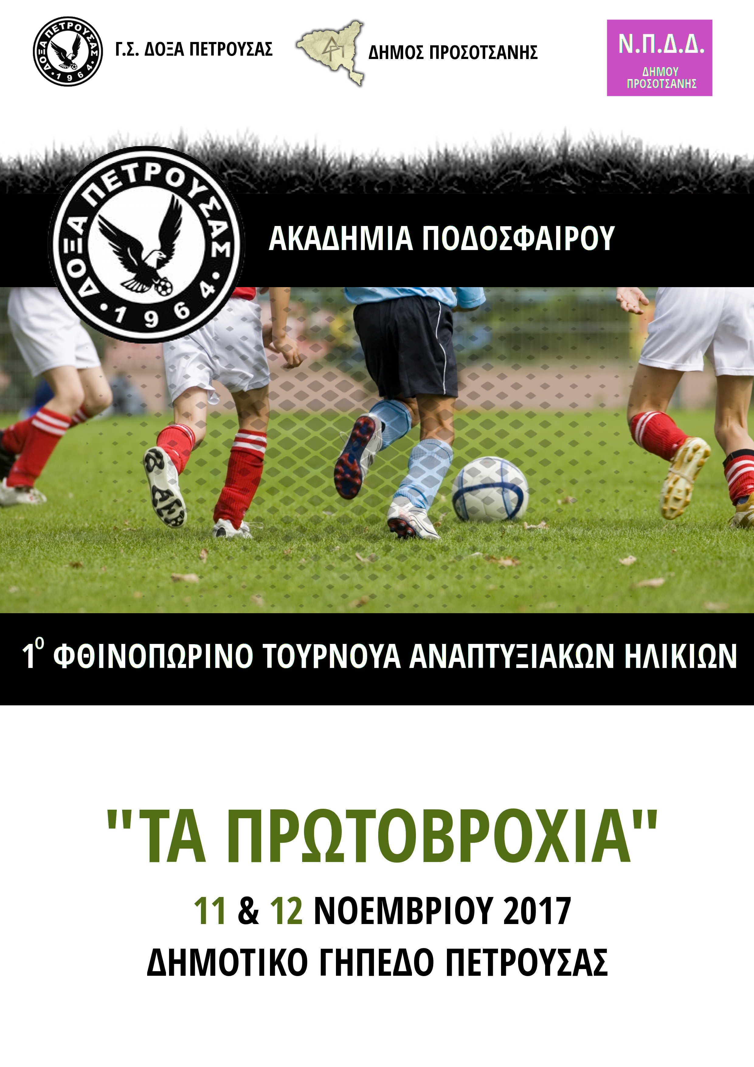 H Ακαδημία ποδοσφαίρου του Γ. Σ. ΔΟΞΑ ΠΕΤΡΟΥΣΑΣ, ο Δήμος Προσοτσάνης και το ΝΠΔΔ του Δήμου Προσοτσάνης σας προσκαλούν στο 1ο Φθινοπωρινό Τουρνουά Ποδοσφαίρου Αναπτυξιακών Ηλικιών «ΤΑ ΠΡΩΤΟΒΡΟΧΙΑ» που θα πραγματοποιηθεί στις 11 & 12 Νοεμβρίου 2017 στο Δημοτικό Γήπεδο Πετρούσας, με τη συμμετοχή παιδιών με έτη γέννησης 2007-2008 καθώς και 2010-2011-2012.