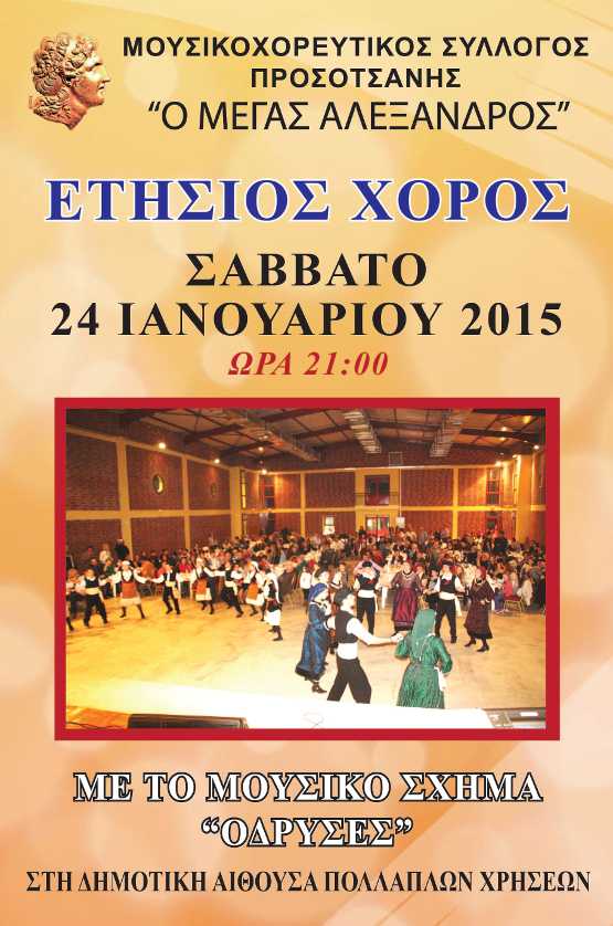 Το Δ.Σ. του Μουσικοχορευτικού Συλλόγου Προσοτσάνης «Ο Μέγας Αλέξανδρος» σας προσκαλεί στον ετήσιο χορού που θα πραγματοποιηθεί το Σάββατο 24 Ιανουαρίου 2015 και ώρα 21:00 στη δημοτική αίθουσα πολλαπλών χρήσεων Προσοτσάνης, με το παραδοσιακό μουσικό σχήμα «ΟΔΡΥΣΕΣ».