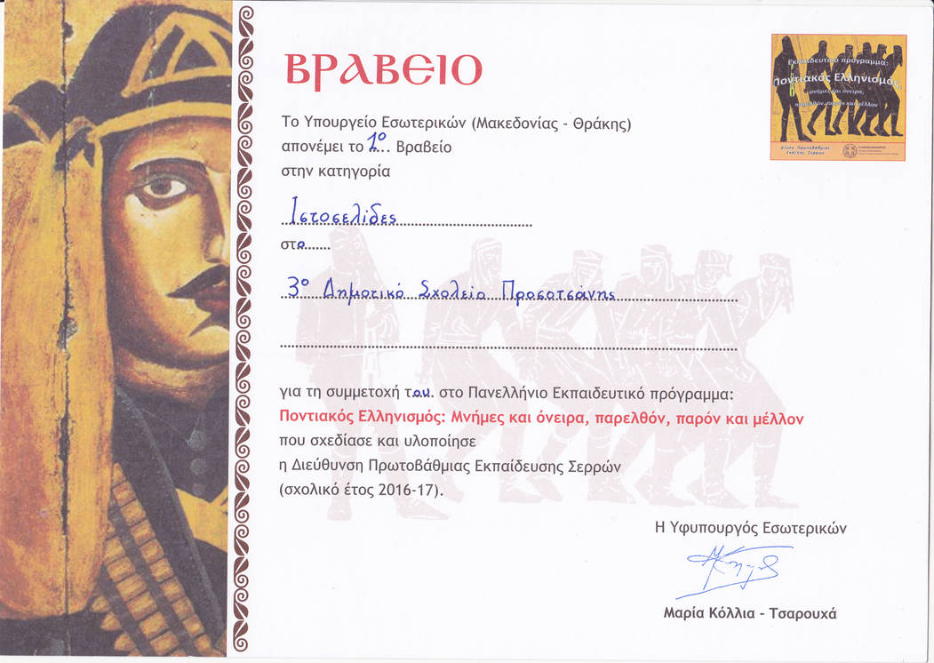 Οι μαθητές των ΣΤ΄, Ε΄ και Β΄ τάξεων του σχολικού έτους 2016-2017 του 3ου Δημοτικού Σχολείου Προσοτσάνης έλαβαν μέρος στο 1ο πανελλήνιο εκπαιδευτικό πρόγραμμα-διαγωνισμό με θέμα: «Ποντιακός ελληνισμός: μνήμες και όνειρα, παρελθόν, παρόν και μέλλον», το οποίο συνδιοργάνωσαν η Πρωτοβάθμια Εκπαίδευση Σερρών και το Υπουργείο Εσωτερικών.