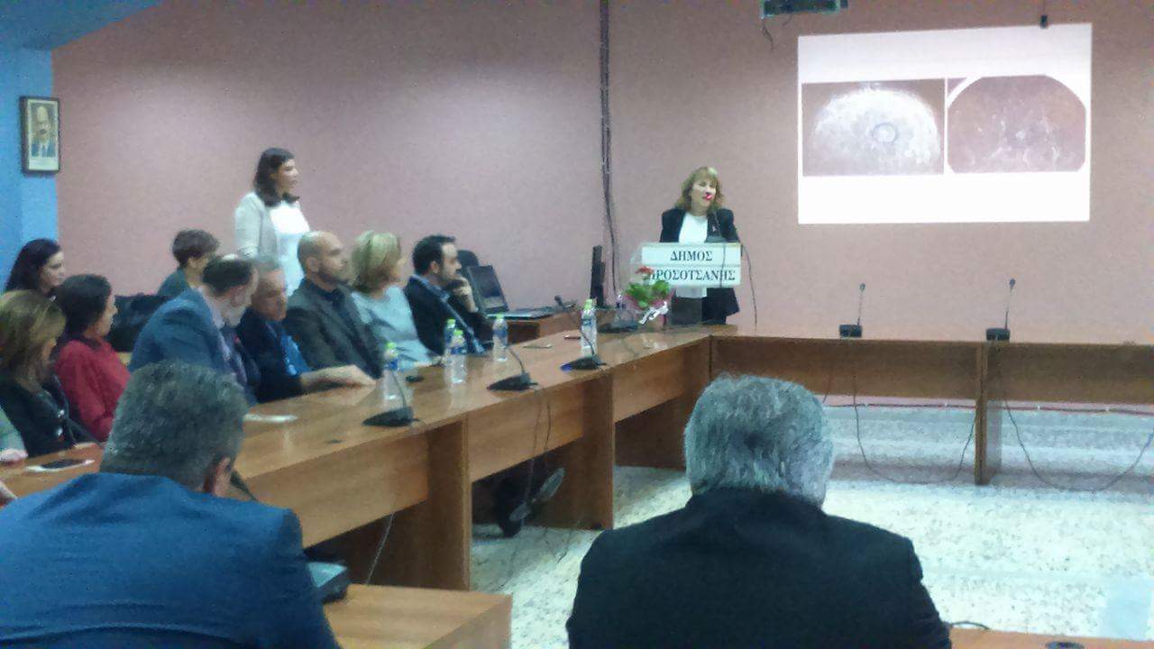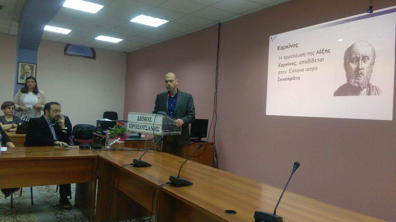 Στην ομιλία, που έλαβε χώρα την 11:00 π.μ., η Πρόεδρος της Δημοτικής Επιτροπής Ισότητας των Φύλων του Δήμου Προσοτσάνης, κυρία Ελένη Τσαούση αναφέρθηκε στην Παγκόσμια Ημέρα της Γυναίκας και καλωσόρισε τα μέλη του Δ.Σ. του Συλλόγου Γυναικών με Καρκίνου του Μαστού ΑΛΜΑ ΖΩΗΣ Ν.Θεσσαλονίκης, και ευχαρίστησε θερμά τον κύριο Άρη Τσιφτσόγλου και την επιστημονική ομάδα του για την παρουσία τους στην Προσοτσάνη, την εξέταση των γυναικών του Δήμου και την καθοριστική συμβολή τους στην επιτυχία της εκδήλωσης. Στη συνέχεια χαιρέτησαν την εκδήλωση ο Δήμαρχος Προσοτσάνης κύριος Άγγελος Λύσσελης και η Πρόεδρος του Συλλόγου Γυναικών με Καρκίνου του Μαστού ΑΛΜΑ ΖΩΗΣ Ν. Θεσσαλονίκης κυρία Κούλα Δερεκενάρη. Έπειτα ο κύριος Τσιφτσόγλου, ο κύριος Δεσίρης και η κυρία Μαλανδρή πήραν με αντίστοιχη σειρά το λόγο και αναφέρθηκαν στη σπουδαιότητα της πρόληψης και της έγκαιρης διάγνωσης όσο αφορά στην ίαση του Καρκίνου του Μαστού, μίλησαν για τους ανασταλτικούς παράγοντες της πρόληψης, για την αναγκαιότητα των εξετάσεων, τις εξεταστικές μεθόδους, τα συμπτώματα, τους τρόπους αντιμετώπισης και τους κινδύνους της ασθένειας. Ο λόγος τους ήταν σύντομος και περιεκτικός, και με την επιστημονική τους κατάρτιση και εμπειρία προέτρεψαν όλες τις γυναίκες να πραγματοποιούν προληπτικούς ελέγχους.