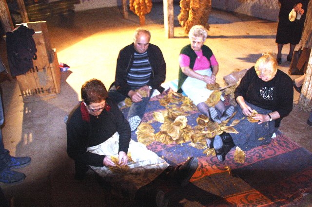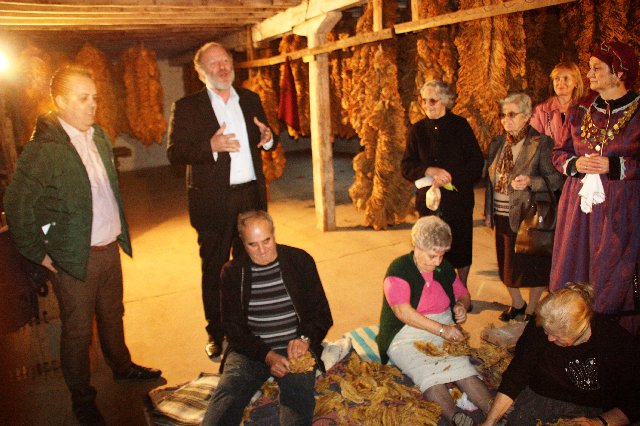 Στο Καπνομάγαζο που βρίσκεται στο χώρο του ναΐσκου του Αγίου Δημητρίου, μέλη του Συλλόγου μας αναπαραστήσανε δύο κύριες χειρονακτικές εργασίες της επίπονης επεξεργασίας του καπνού, όπως γίνονταν παλιά. Πιο συγκεκριμένα, του μπουρλιάσματος ή βελονιάσματος και του πασταλιάσματος (συσκευάσματος) σε δέματα. Ο πρόεδρος του συλλόγου κ. Κων/νος Παπαδόπουλος, εξήγησε στους παρευρισκόμενος, τα στάδια επεξεργασίας του καπνού και τη σημασία που έπαιξε η καλλιέργειά του στην οικονομική άνθιση της Προσοτσάνης κατά τους προηγούμενους αιώνες, ενώ προβάλλονταν παλιές φωτογραφίες Προσοτσανιωτών από διάφορες εργασίες της καλλιέργειας του καπνού. Παράλληλα, οι γυναίκες του Συλλόγου κέρασαν τον κόσμο σιμιγδαλένιο χαλβά, όπως γινόταν παλαιότερα κατά την τελευταία ημέρα των παραπάνω εργασιών.