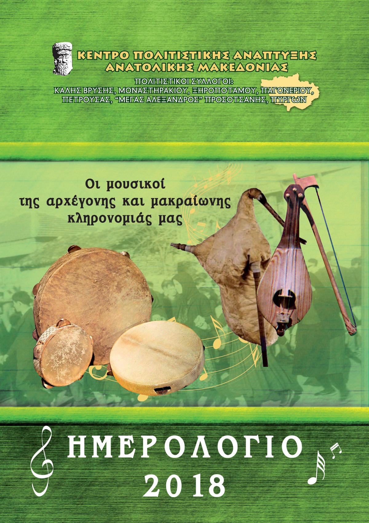 Το Κέντρο Πολιτιστικής Ανάπτυξης Ανατολικής Μακεδονίας εκδίδει για το έτος 2018 και για 9η συνεχή χρονιά ημερολόγιο, που το αφιερώνει «στους μουσικούς της αρχέγονης και μακραίωνης κληρονομιάς μας», σ’ αυτούς που με τον τρόπο τους ο καθένας ξεχωριστά συνέβαλαν στη διαμόρφωση της μουσικής μας ιστορίας.