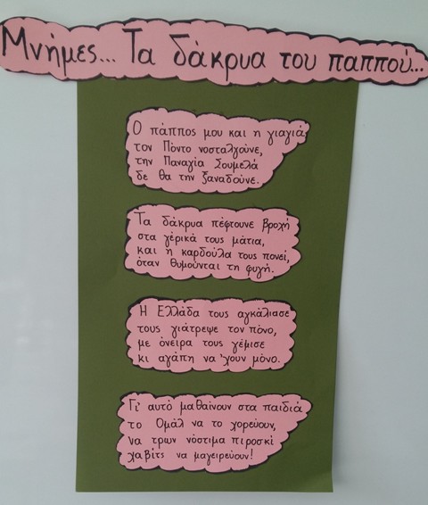 Οι μικροί μαθητές και οι μαθήτριες, με την καθοδήγηση της δασκάλας τους κ. Ψωμά Στυλιανής και του μουσικού του σχολείου τους κ. Βασιλειάδη Ευάγγελου, συμμετείχαν στον εν λόγω διαγωνισμό με το τραγούδι τους «Μνήμες: Τα δάκρυα του παππού».