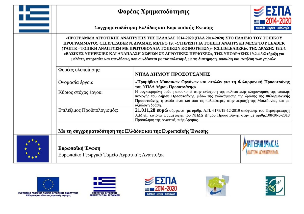 Με στόχο την ενίσχυση της πολιτιστικής κληρονομιάς της τοπικής περιοχής του Δήμου Προσοτσάνης, το ΝΠΔΔ Δήμου Προσοτσάνης, προέβει στην προμήθεια Μουσικών Οργάνων και στολών για τη Φιλαρμονική Προσοτσάνης, κατόπιν:
