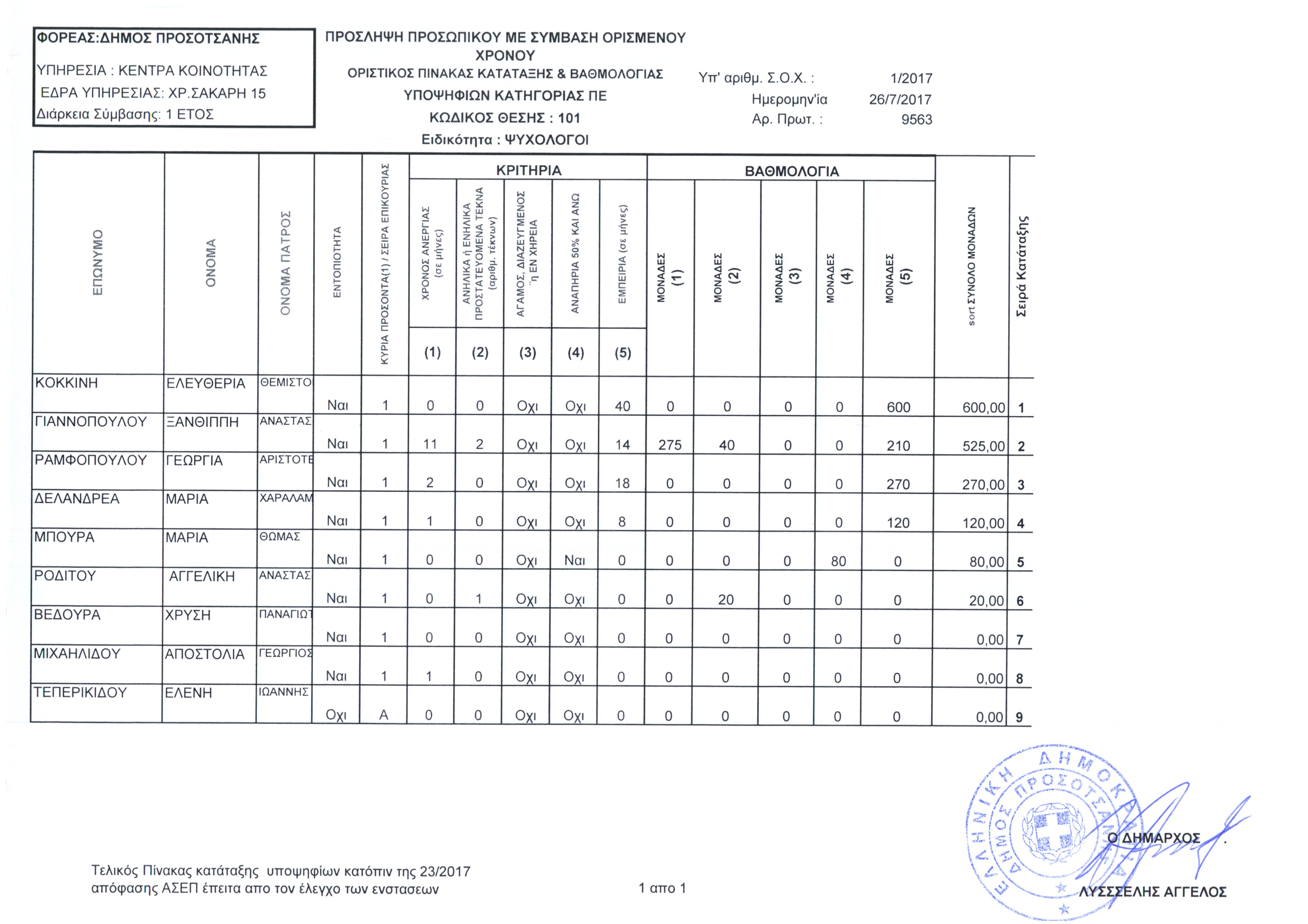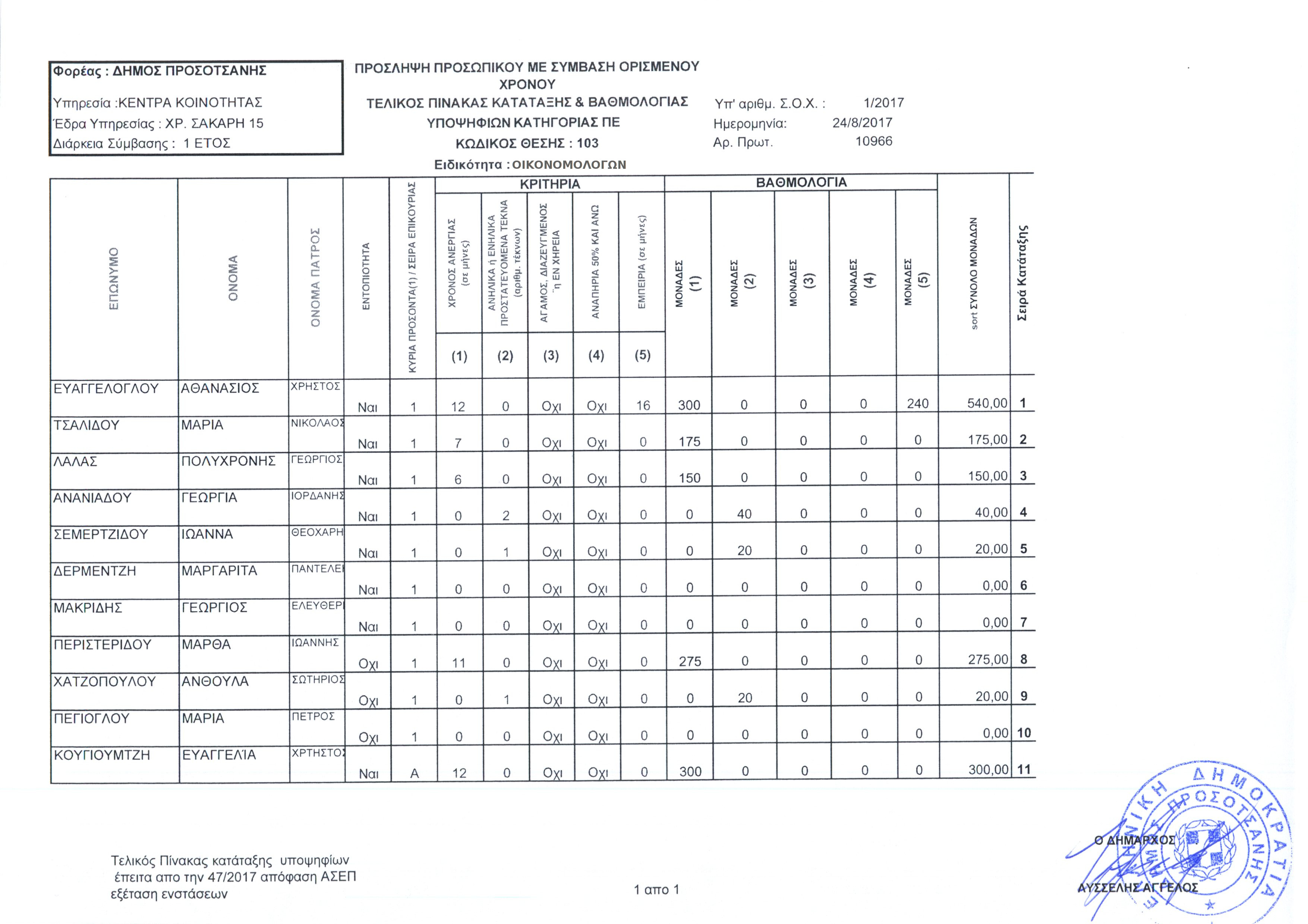 Αναμορφωνόμενοι, τελικοί, πίνακες κατάταξης έπειτα από τον έλεγχο των ενστάσεων από ΑΣΕΠ, των αντιστοίχων ειδικοτήτων, της 1/2017 ΣΟΧ Ανακοίνωσης, για την πρόσληψη με σύμβαση εργασίας ορισμένου έργου τριών (3) υπαλλήλων θέσεων ενός ΠΕ Ψυχολόγου, ενός ΠΕ/ΤΕ Κοινωνικού Λειτουργού και ενός ΠΕ Οικονομολόγου για την κάλυψη των αναγκών του «Κέντρου Κοινότητας» του Δήμου Προσοτσάνης.